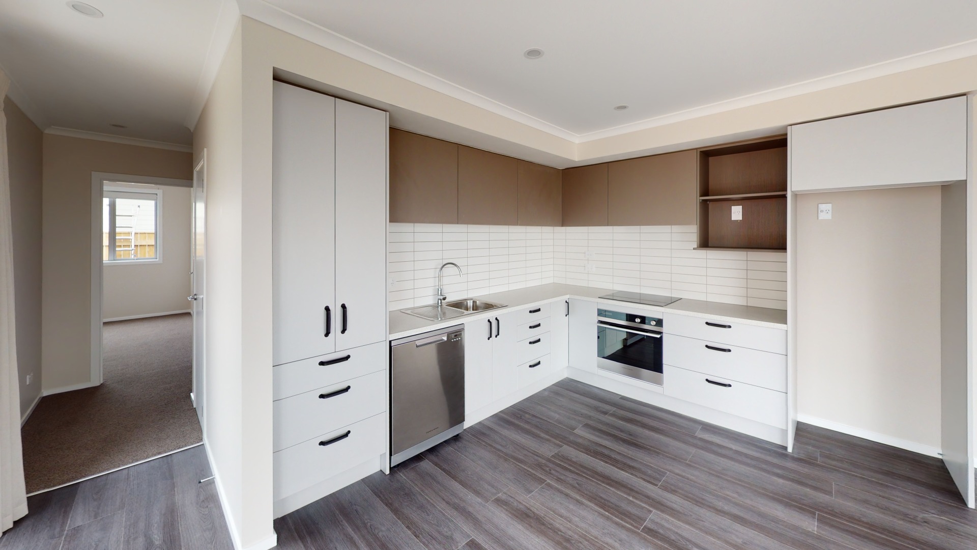– Modern kitchen with an electric cooktop, oven & dishwasher